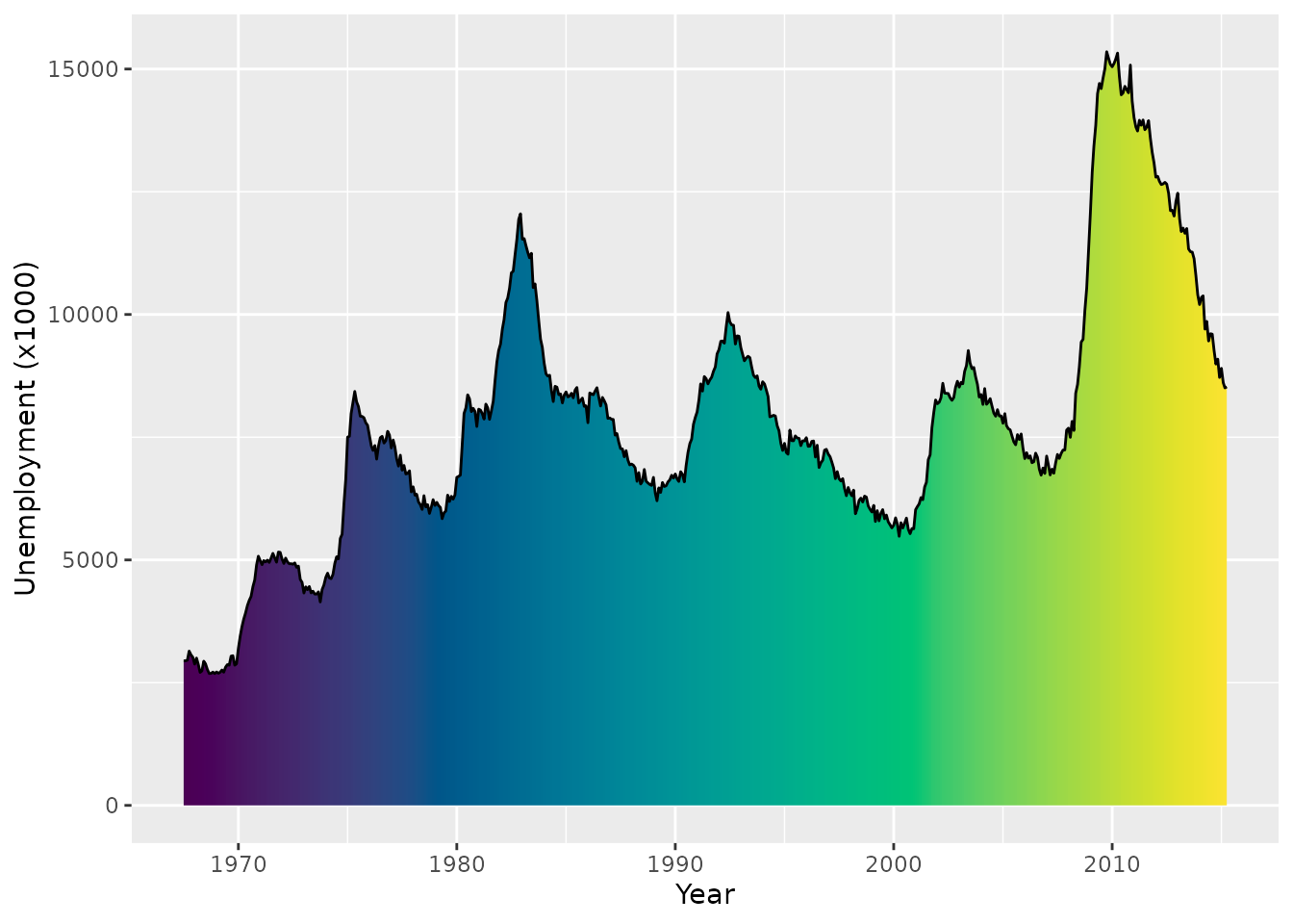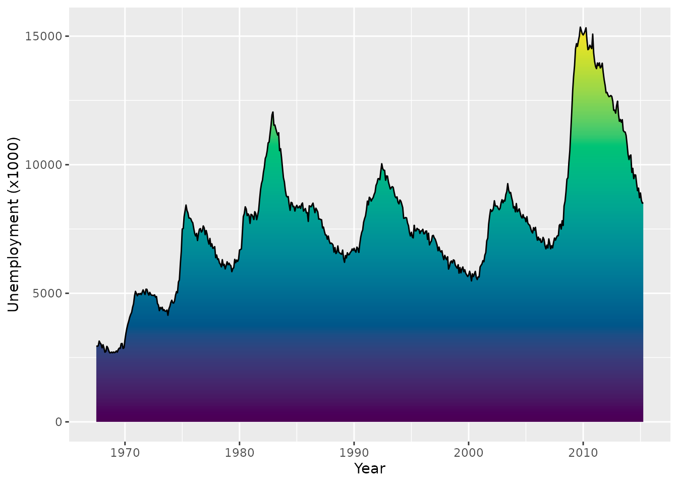 For a horizontal gradient, keep y1 and y2 the same. The default.units = "npc", meaning that numeric values you provide these arguments are relative to the panel where 0 means bottom and 1 means top. Which exact value doesn’t really matter for this example, just that they are the same.