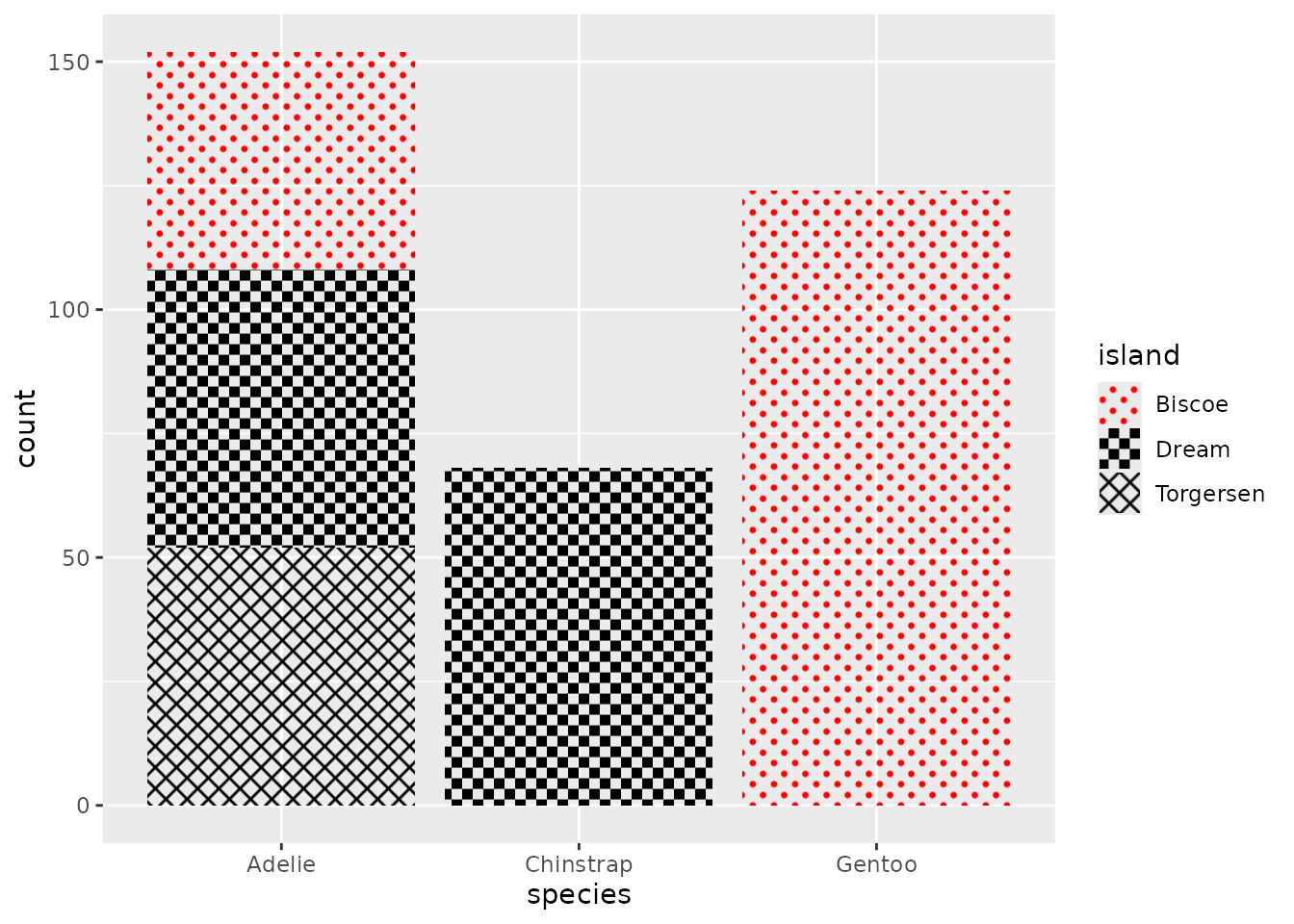 Create a new pattern of your liking. Can you design a polka-dot or checkerboard pattern? You can use grid::circleGrob() and grid::rectGrob() for circles and rectangles respectively. We’ll use it to create a manual fill scale of patterns.
