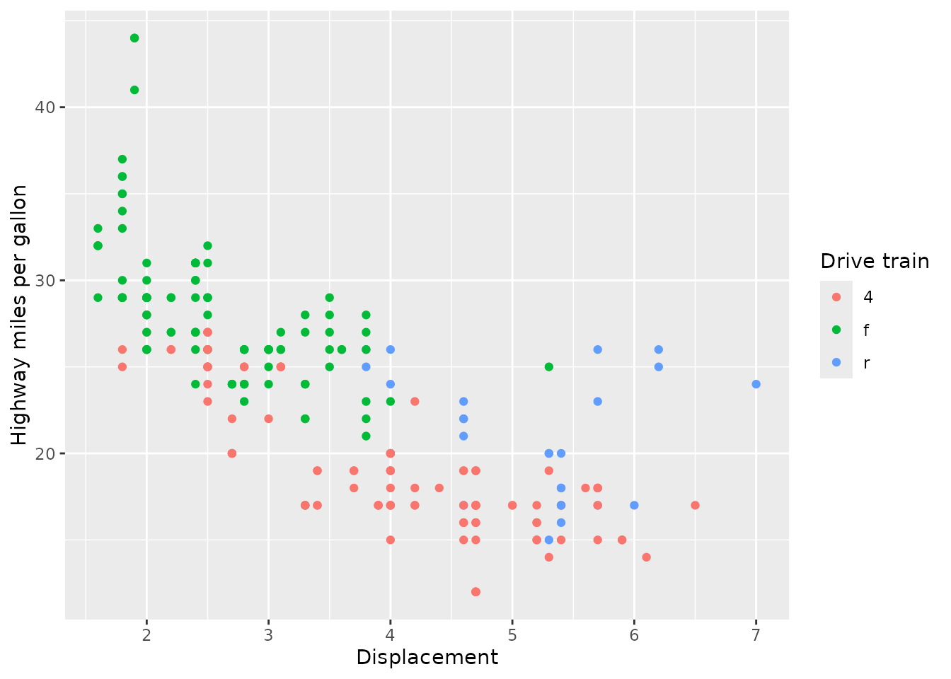 ggplot(mpg, aes(displ, hwy, colour = drv)) +