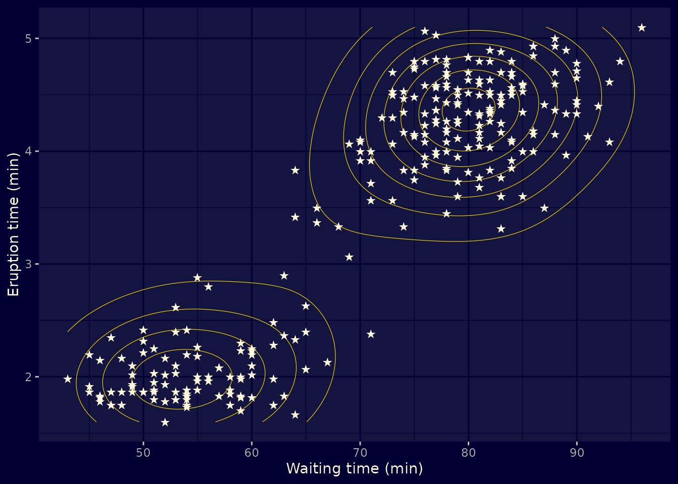 We have the following contour plot of eruption measurements taken from the geyser ‘Old Faithful’.