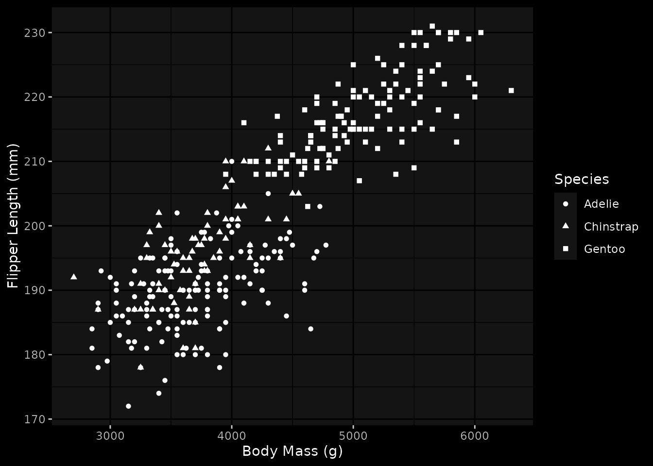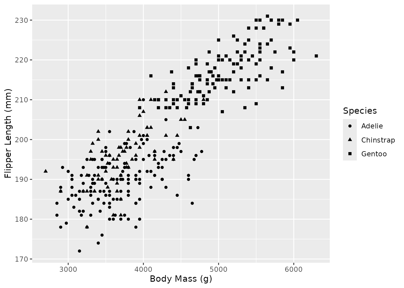 c("🌹", "🌻", "🌷", "🪻", "🪷")Shapes can use emoji because these count as ‘single letter’ strings. The palette can be a character vector that is compatible with scales::as_discrete_pal().