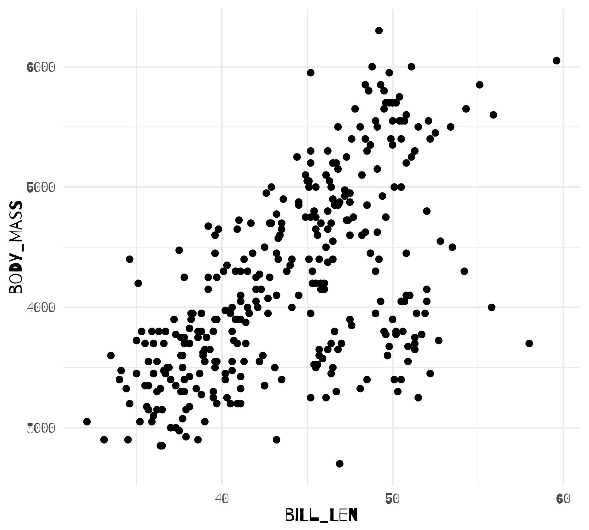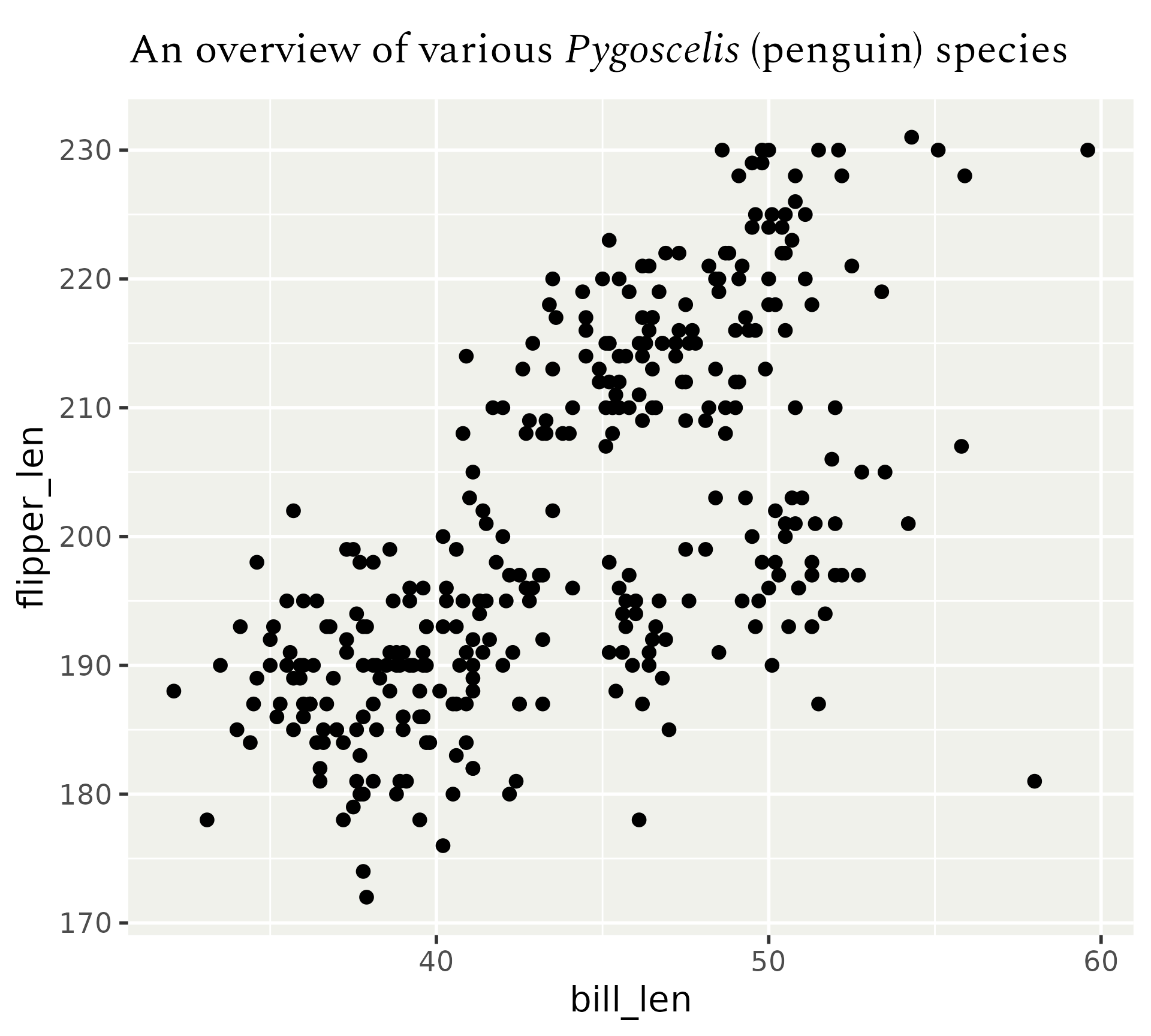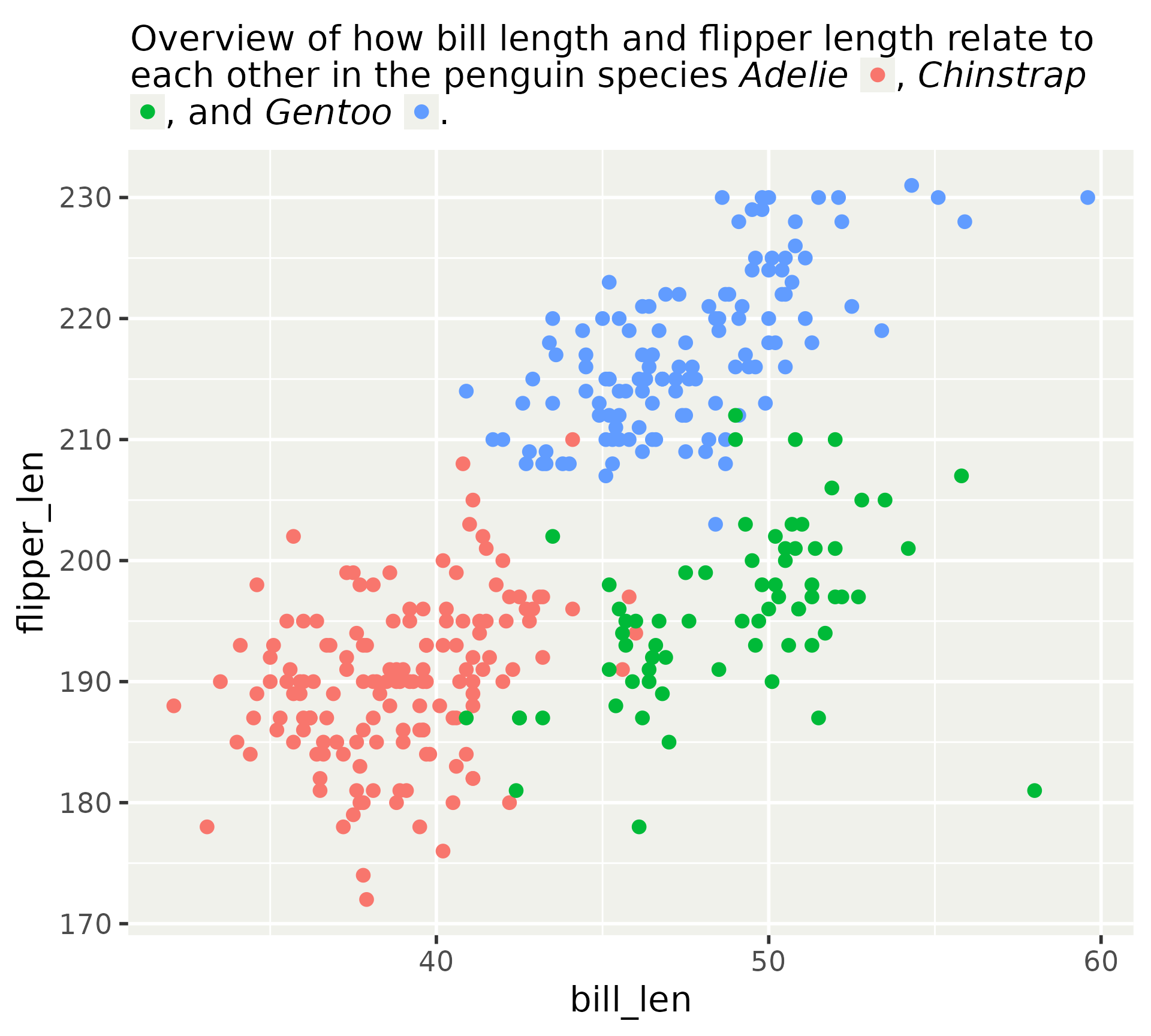 aes(x = bill_len, y = flipper_len)