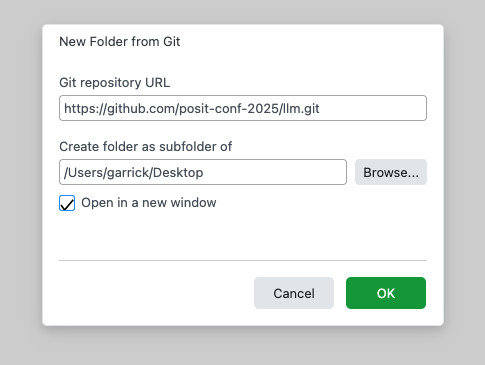 In Positron, use File > New Folder from Git…. Enter the repository link—https://github.com/posit-conf-2025/llm.git—and choose a location on your computer to save the project.