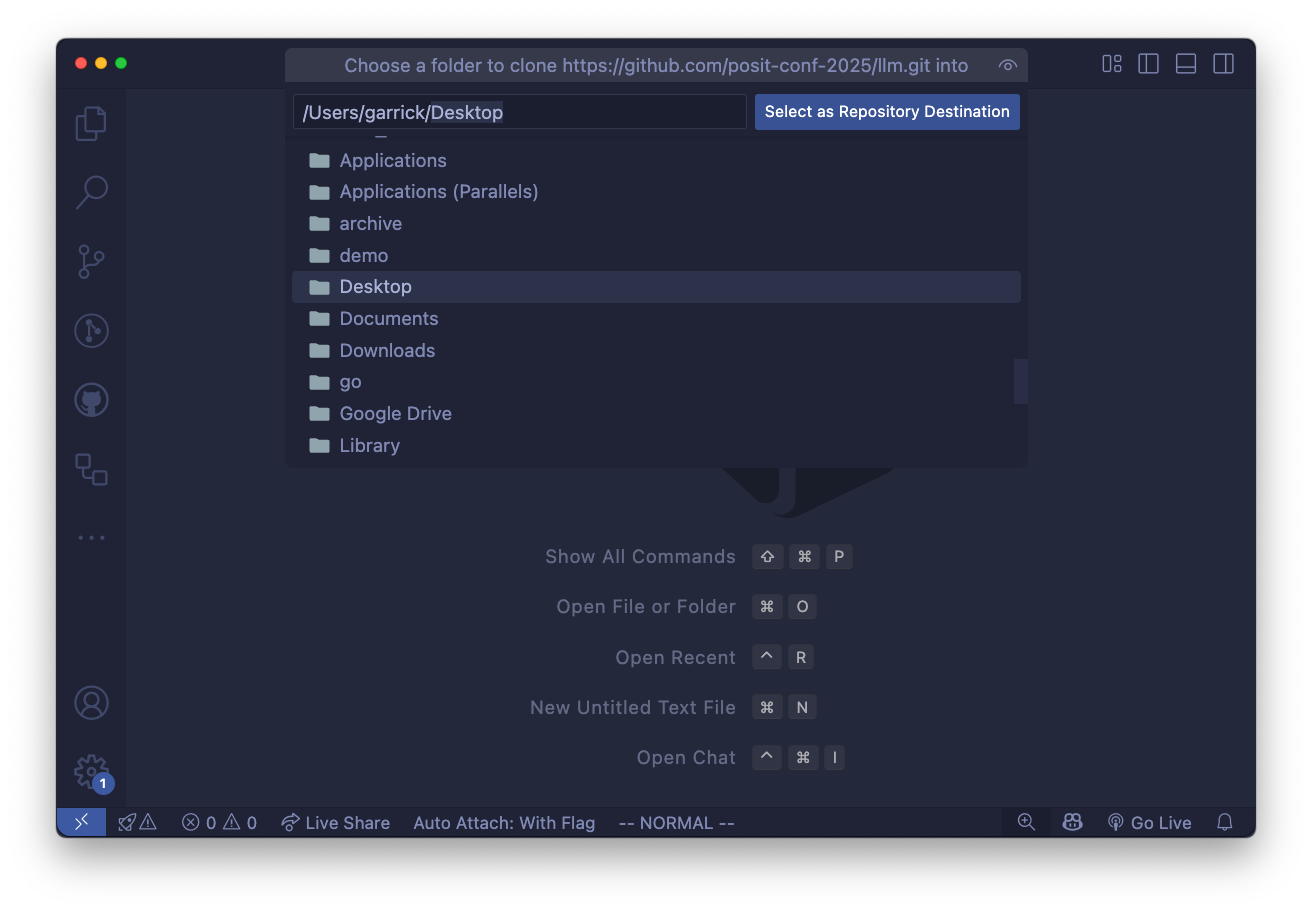 https://github.com/posit-conf-2025/llm.git - Choose a location on your computer to save the project.