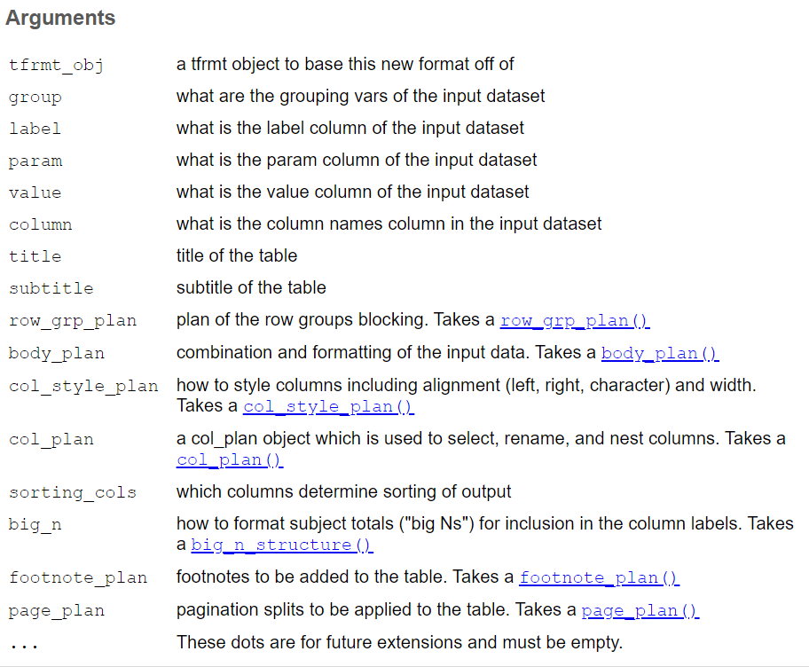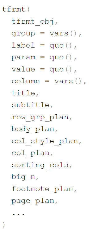 More here: https://gsk-biostatistics.github.io/tfrmtbuilder/