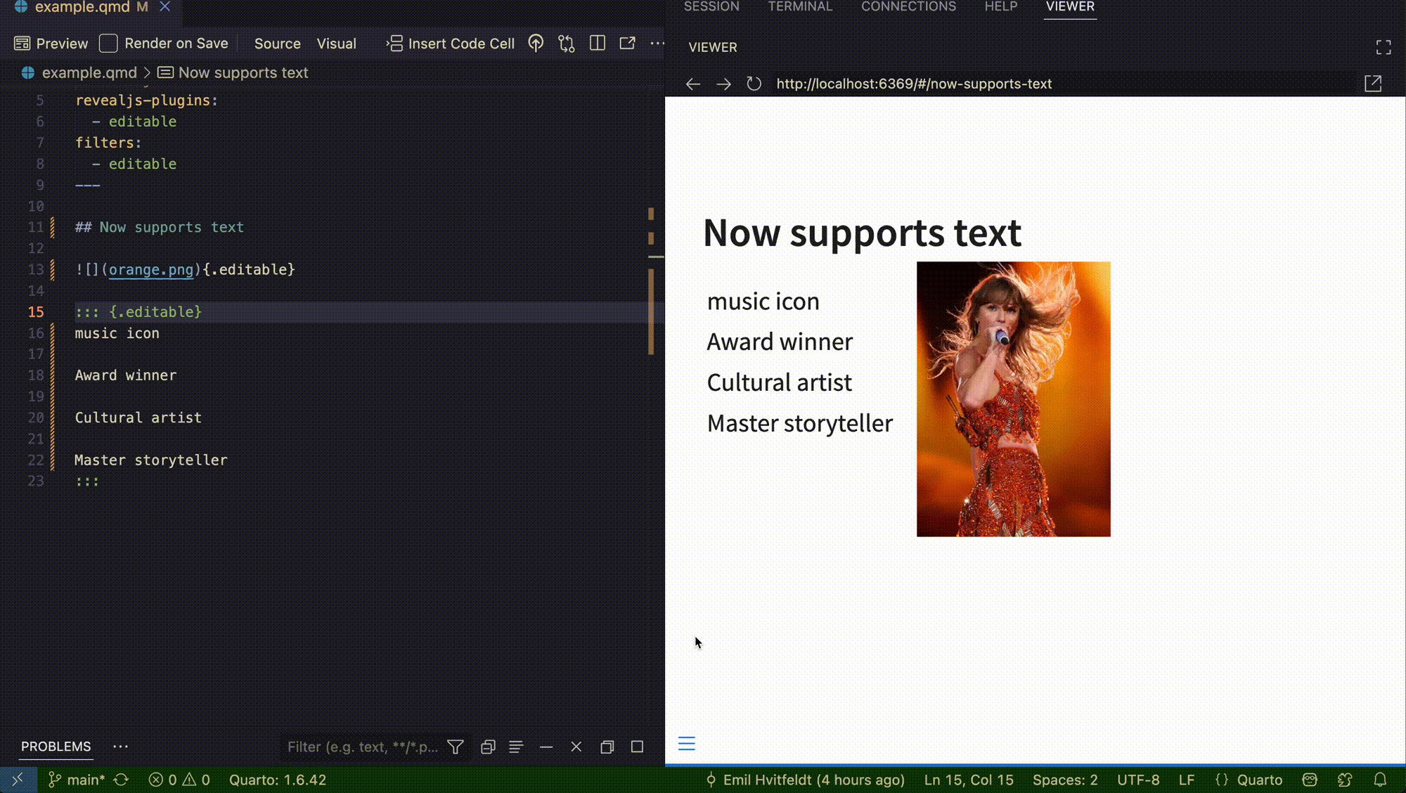 The quarto-revealjs-editable extension allows for the repositioning and resizing of images and text divs directly in previewed slides.