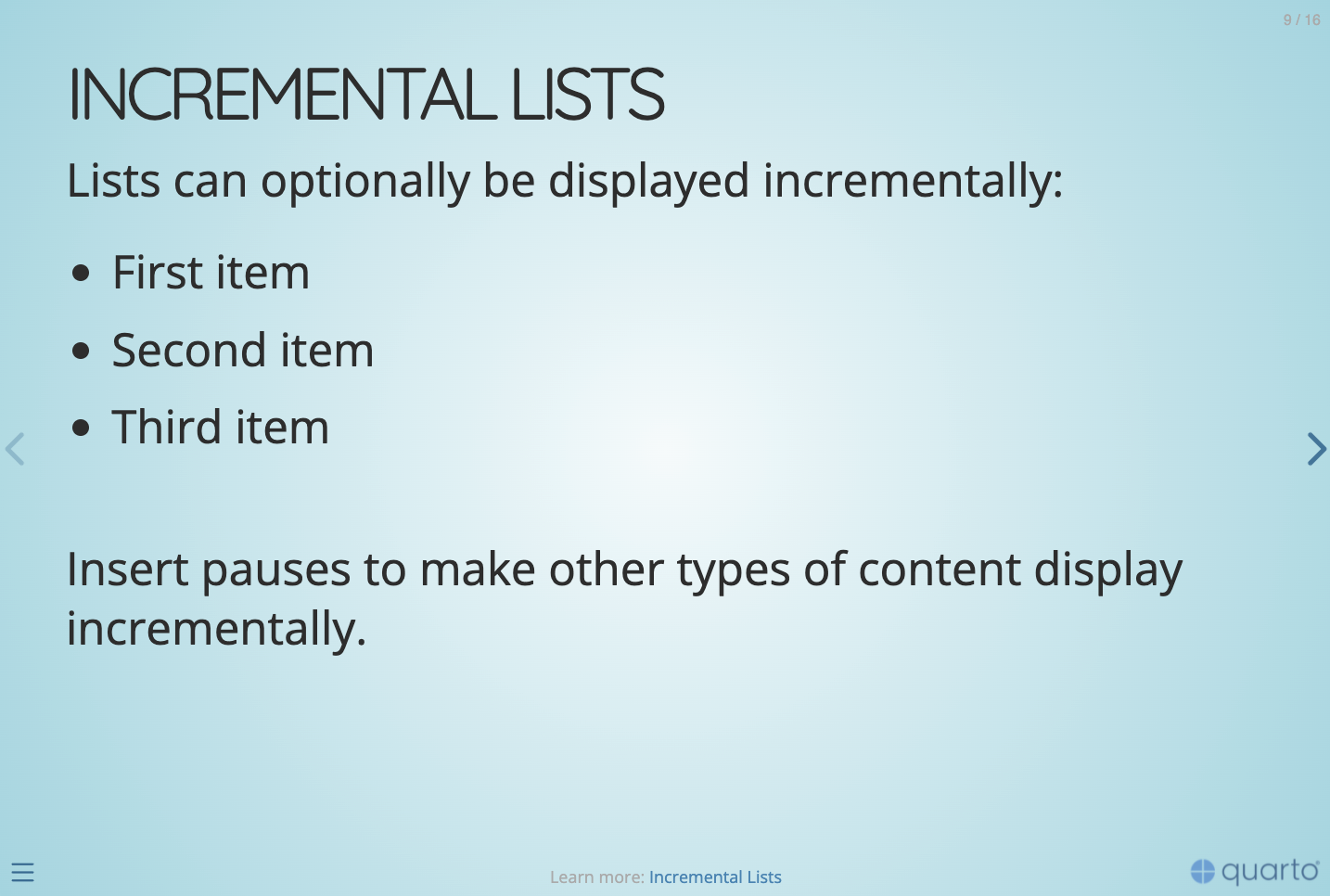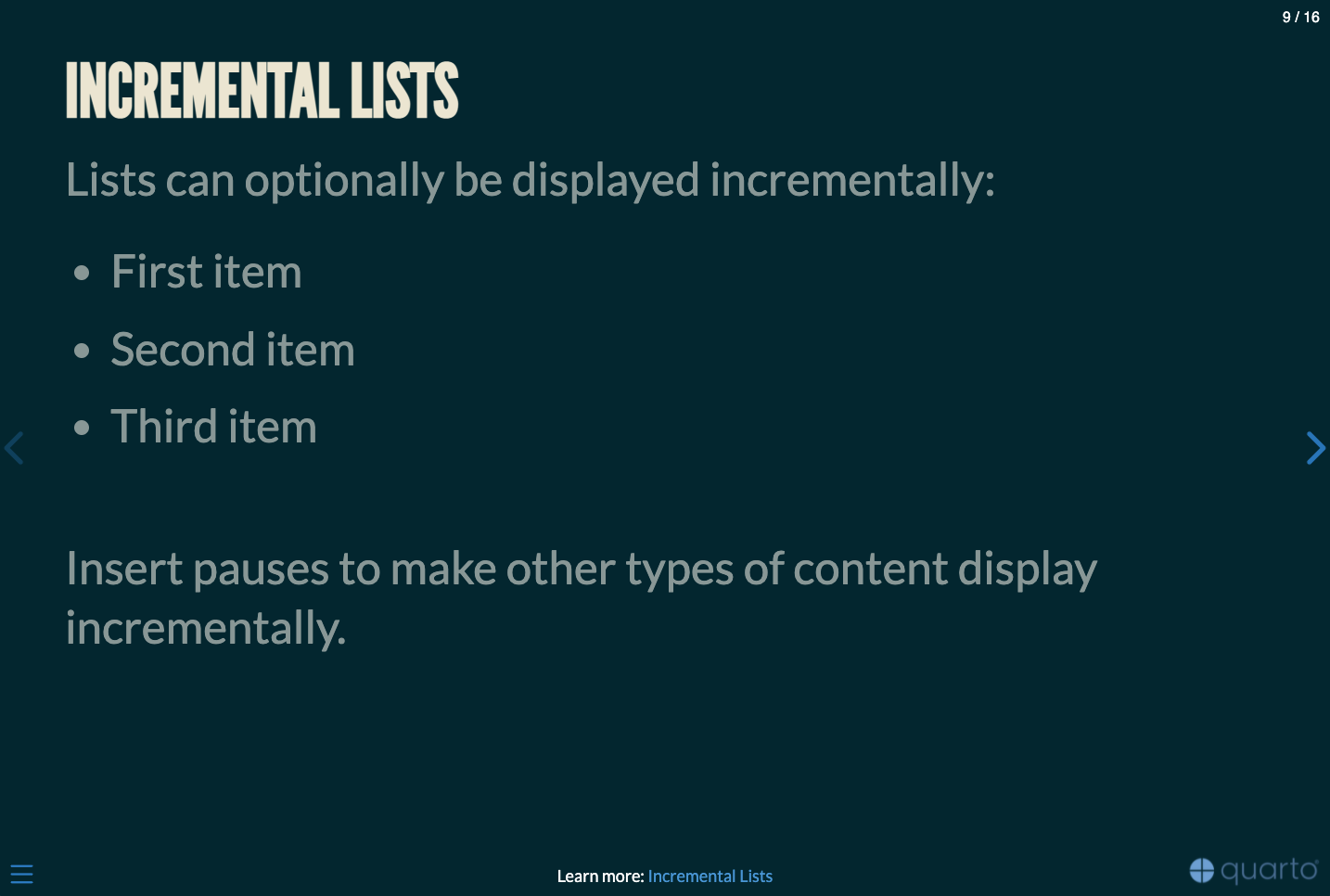 format: html to format: revealjs.#) to create a new slide. Use other Markdown headings and text for content on each slide.Quarto will create an HTML file that is a fully functional slide deck.
