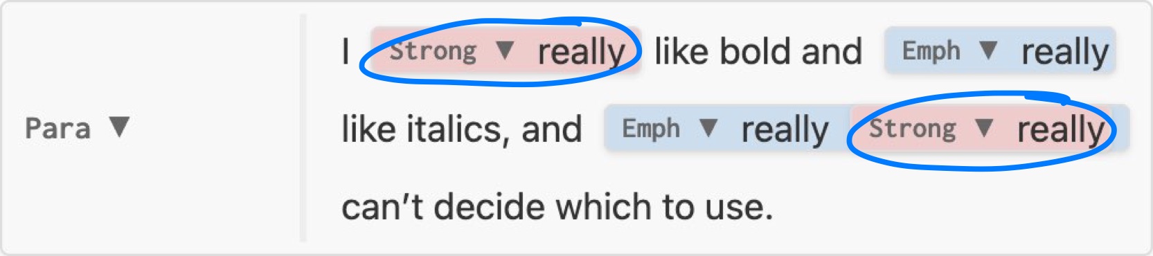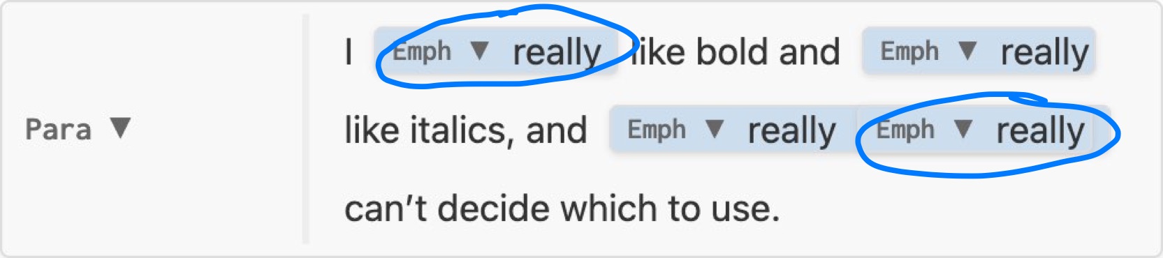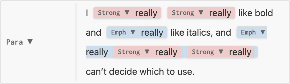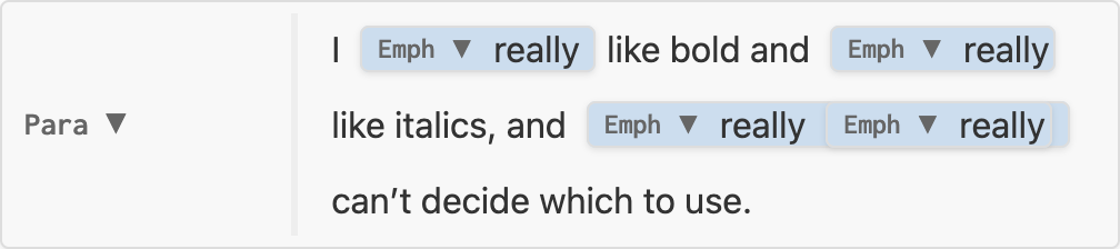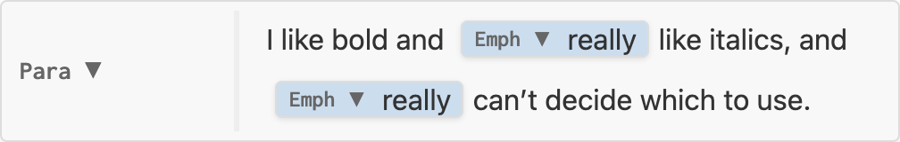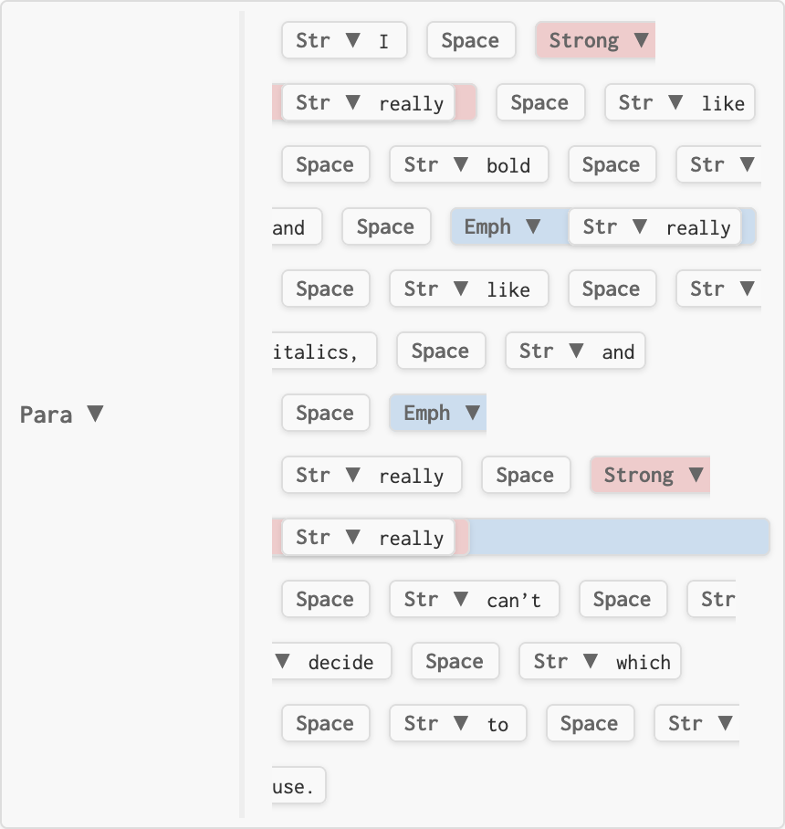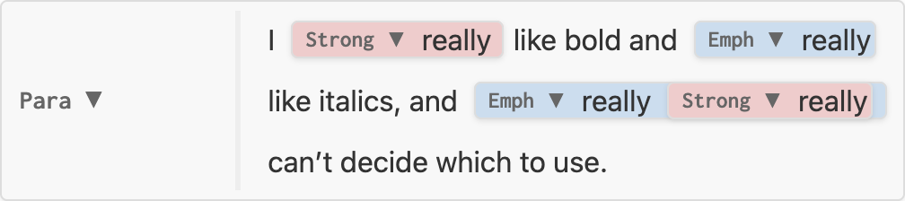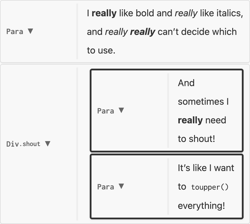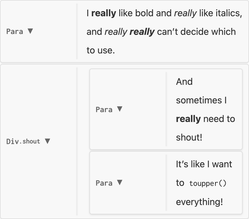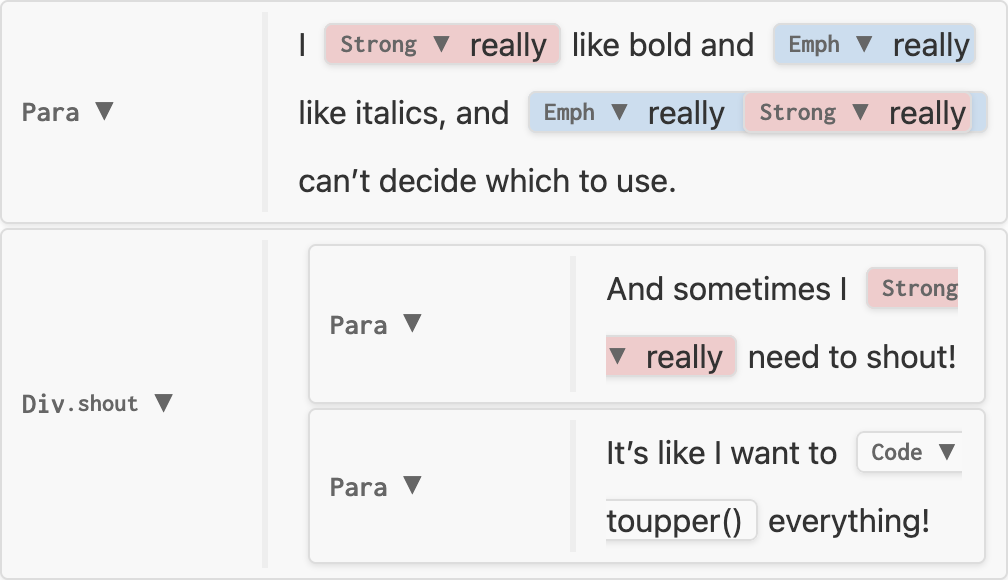 nil, node is unchanged, e.g. no-change.luaInline which replaces the original, e.g. replace-strong.luaInline (known as an Inlines) which replaces the original, spliced into its siblings.Inlines with three elementsI really really like bold and really like italics, and really really really can’t decide which to use.