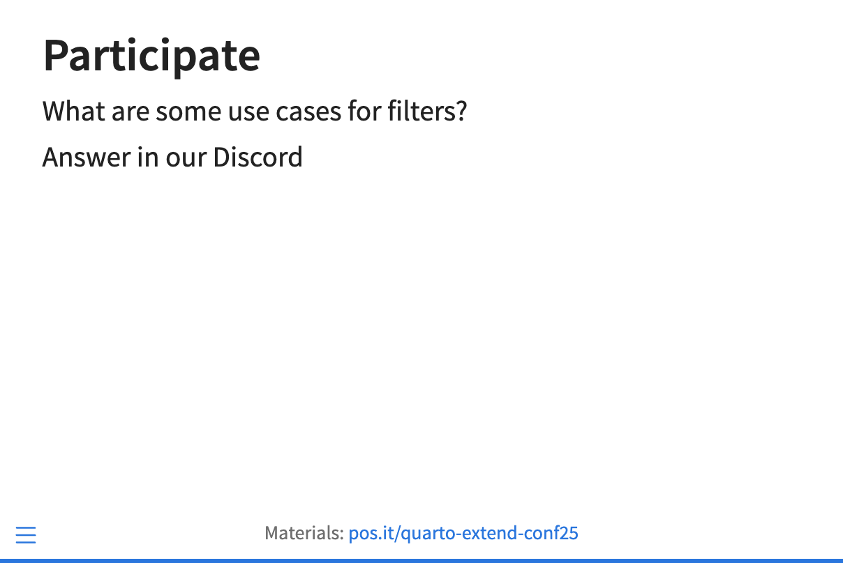 format specific (they operate on the document AST), but can function differently for different formats_extensions are combinations of partials and filters, and possibly other things, that are designed for portability and reusabilityBefore we move on to Q&A, please take a note of the workshop survey: