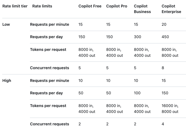 https://docs.github.com/en/github-models/use-github-models/prototyping-with-ai-models#rate-limits